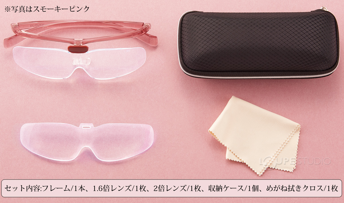 | セット内容 | フレーム/1本 1.6倍レンズ/1枚 2倍レンズ/1枚 収納ケース/1個 めがね拭きクロス/1枚 |